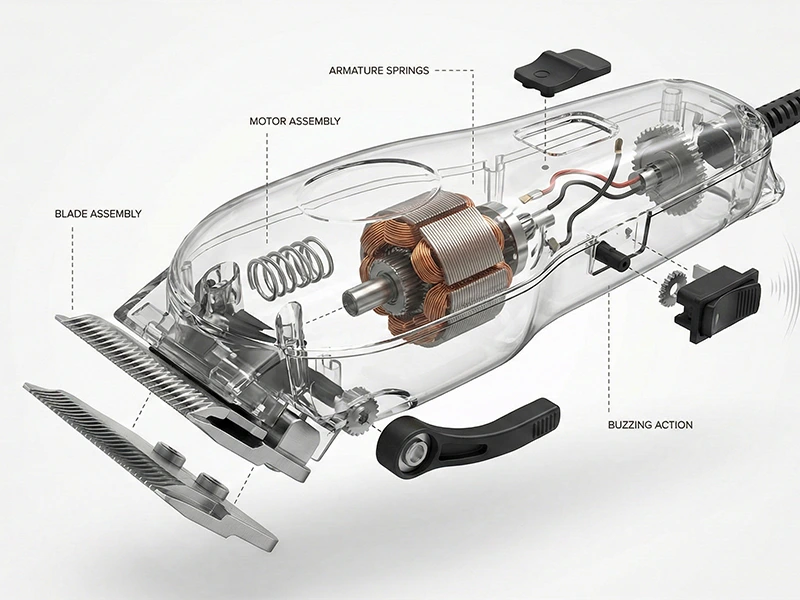 ماشینهای اصلاح، بهخصوص مدلهای لرزشی (مغناطیسی)، ساختار ساده اما دقیقی دارند. وقتی تعادل بین قطعات بههم میخورد، دستگاه شروع به فریاد زدن میکند. بیایید دقیقتر بررسی کنیم که داخل بدنه چه اتفاقی میافتد.